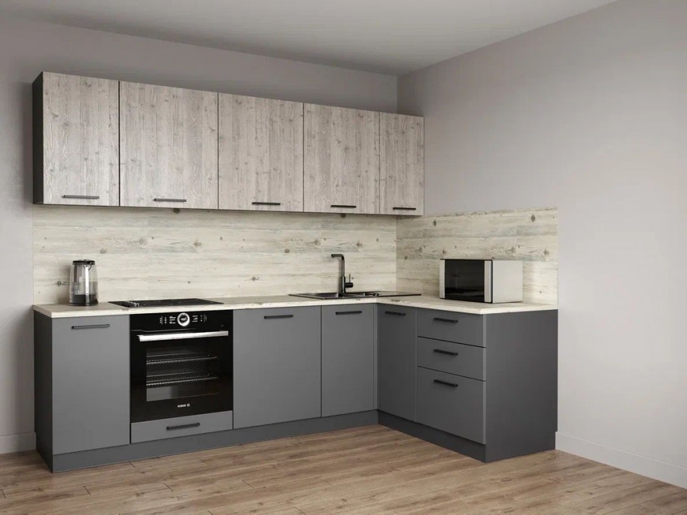 Кухонный гарнитур Антик 2600*1600 (Стол. 26мм) Верх Корпус: Антрацит Верх Фасад: Ель Антик (№3871) МДФ Низ Корпус: Антрацит Низ Фасад: Берлин (№962) МДФ Столешница: Сосна Осло Описание: Корпус ЛДСП 16 мм, кромка ПВХ 0,4 мм. Фасады ЛДСП 16 мм, кромка ПВХ 1мм. Фасады МДФ 16 мм Фасады верхних модулей со свесом 12 мм дают возможность использовать без установки ручек. Петли с доводчиком. Навесы внутренние, регулируемые, с декоративной крышкой. Направляющие шариковые полного, плавного выдвижения с нагрузкой до 30 кг. Столешницы цельные с пластиковым покрытием со скруглением по переднему краю (постформинг толщина 26 мм). Регулируемые ножки-опоры.