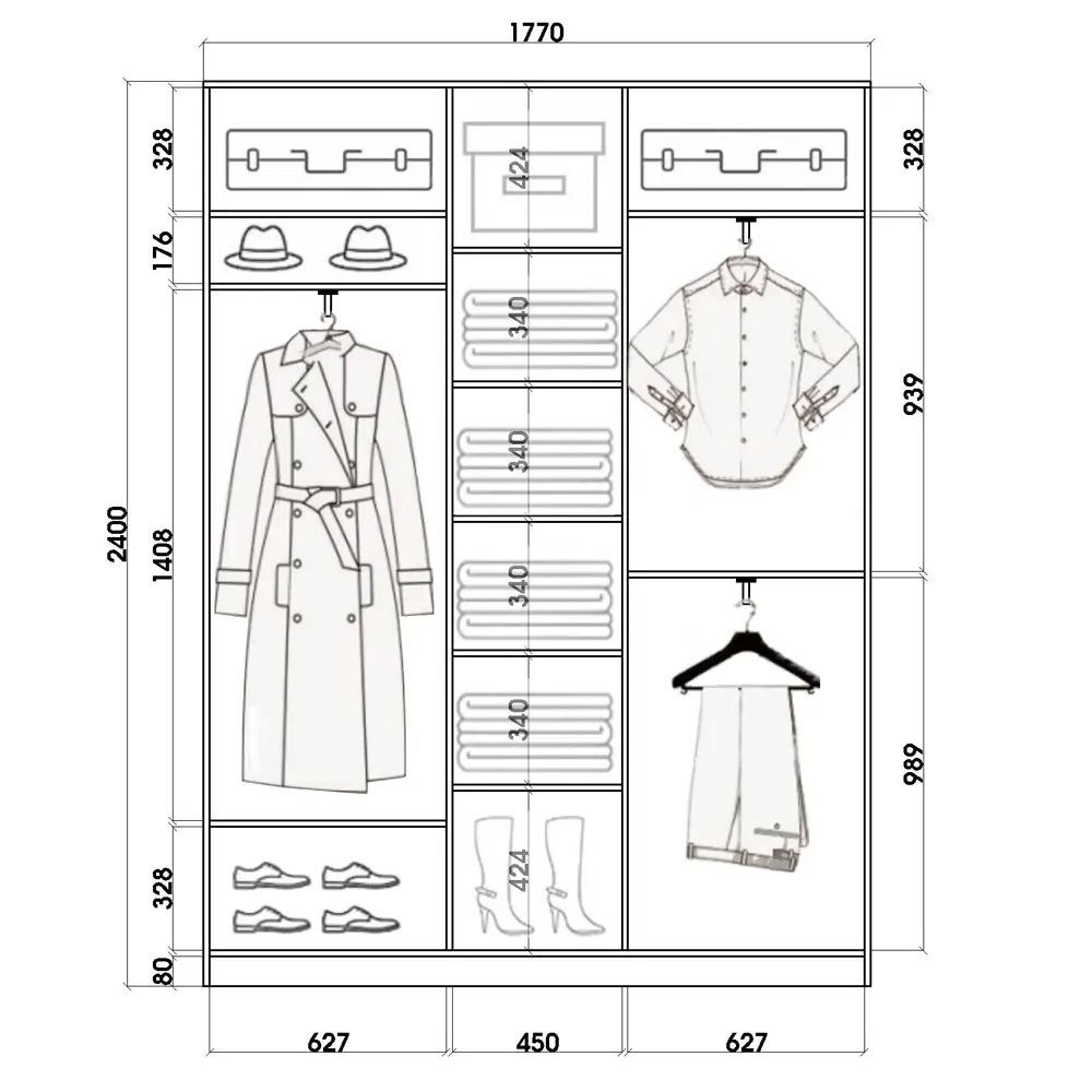 Модель 3-х дверного шкафа (полки в центре)